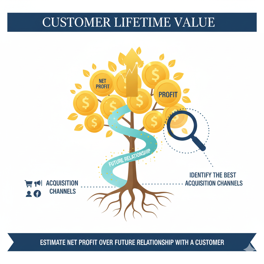Estimate net profit over future relationship with a customer and identify the best acquisition channels